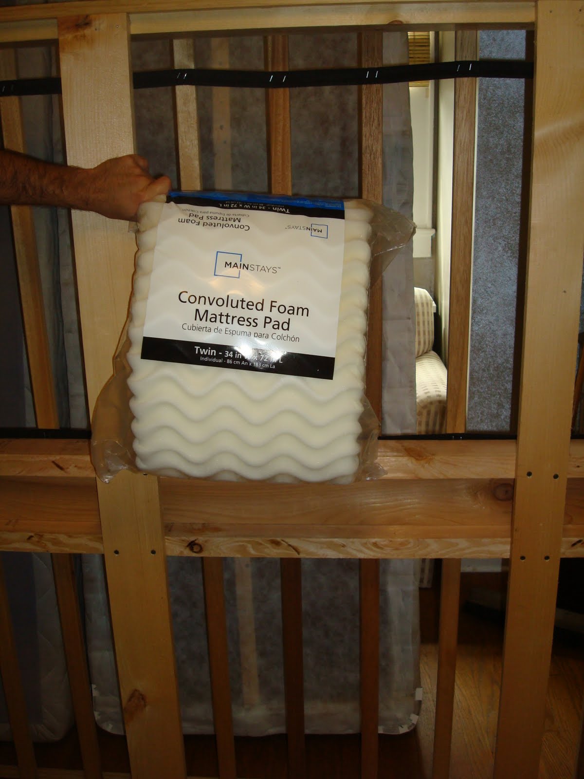 For the base of the bed we purchased two twin sized mattress pads ($9 a pad) and cut them in half length wise. They don’t go completely around so there will be some seams, but under fabric it is not noticeable at all.