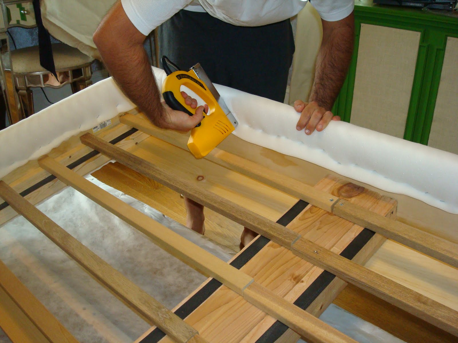 For the base you simply wrap and staple as well You do need to pay a little bit of attention to the corners. We wrapped completely down the side board and around 6″ past the foot board on both sides.