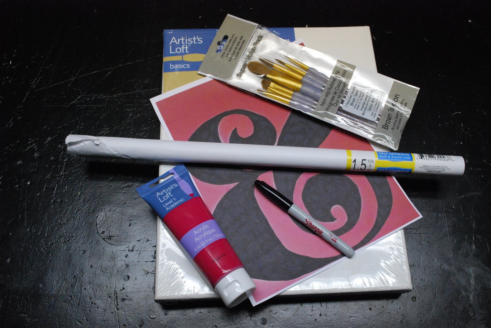 I was actually able to pick up a double packs on canvas boards for $8 at Michaels, along with a tube of paint for $4, paintbrushes I owned, sharpie I owned, contact paper was picked up at dollar store for $1. 🙂