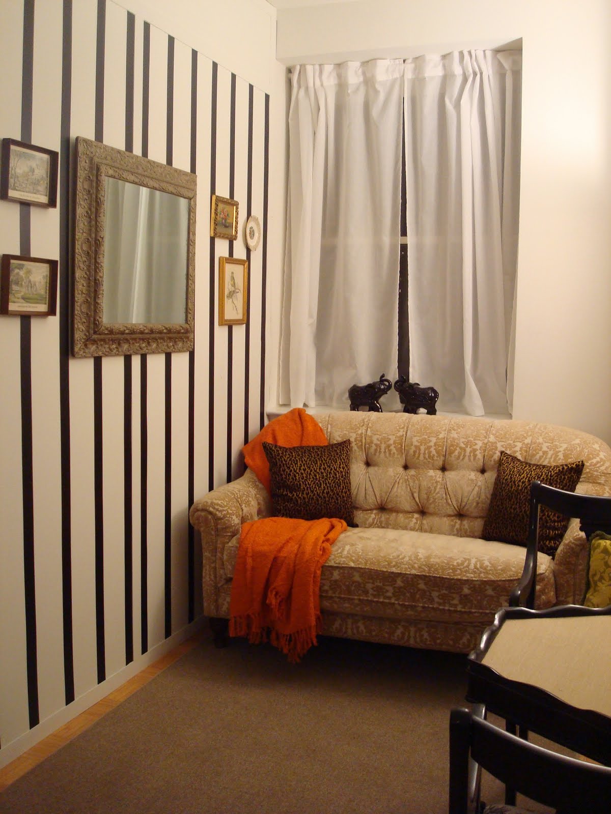Your sister is one lucky lady – LOVE the pinstripes on the walls AND the sofa. Perfect for the tiny space!