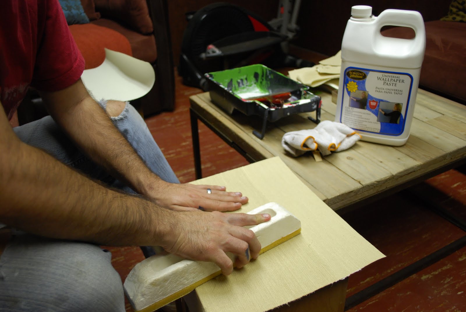 Cut pieces of grasscloth about 2″ larger all around and make sure to apply paste to the paper: