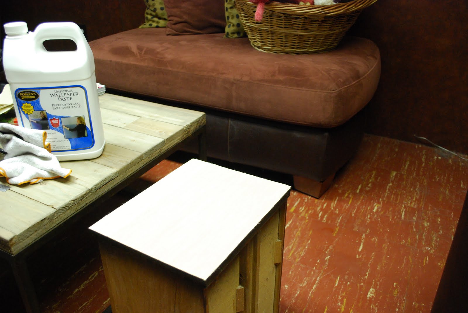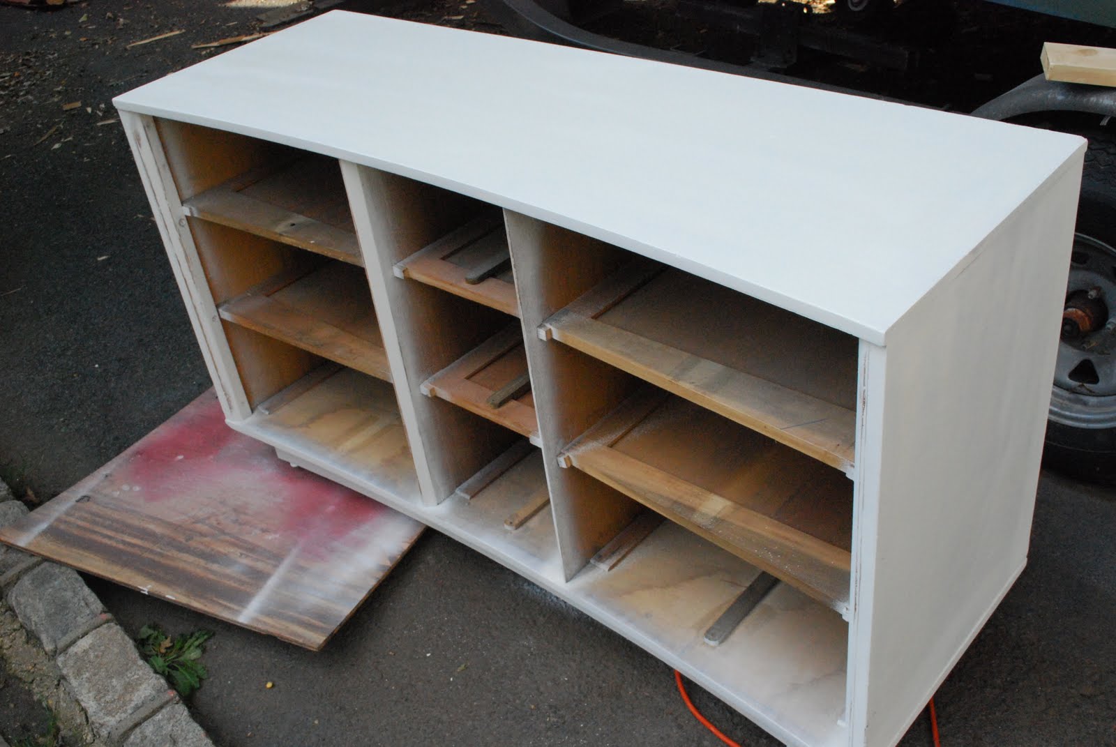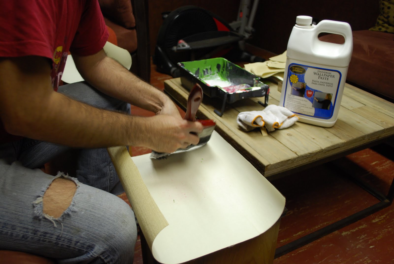 So with 1 can of primer and 2 cans of spray paint we were on our way to new piece. The drawers came next and with the help of left over grass cloth wallpaper and glue we were almost done.