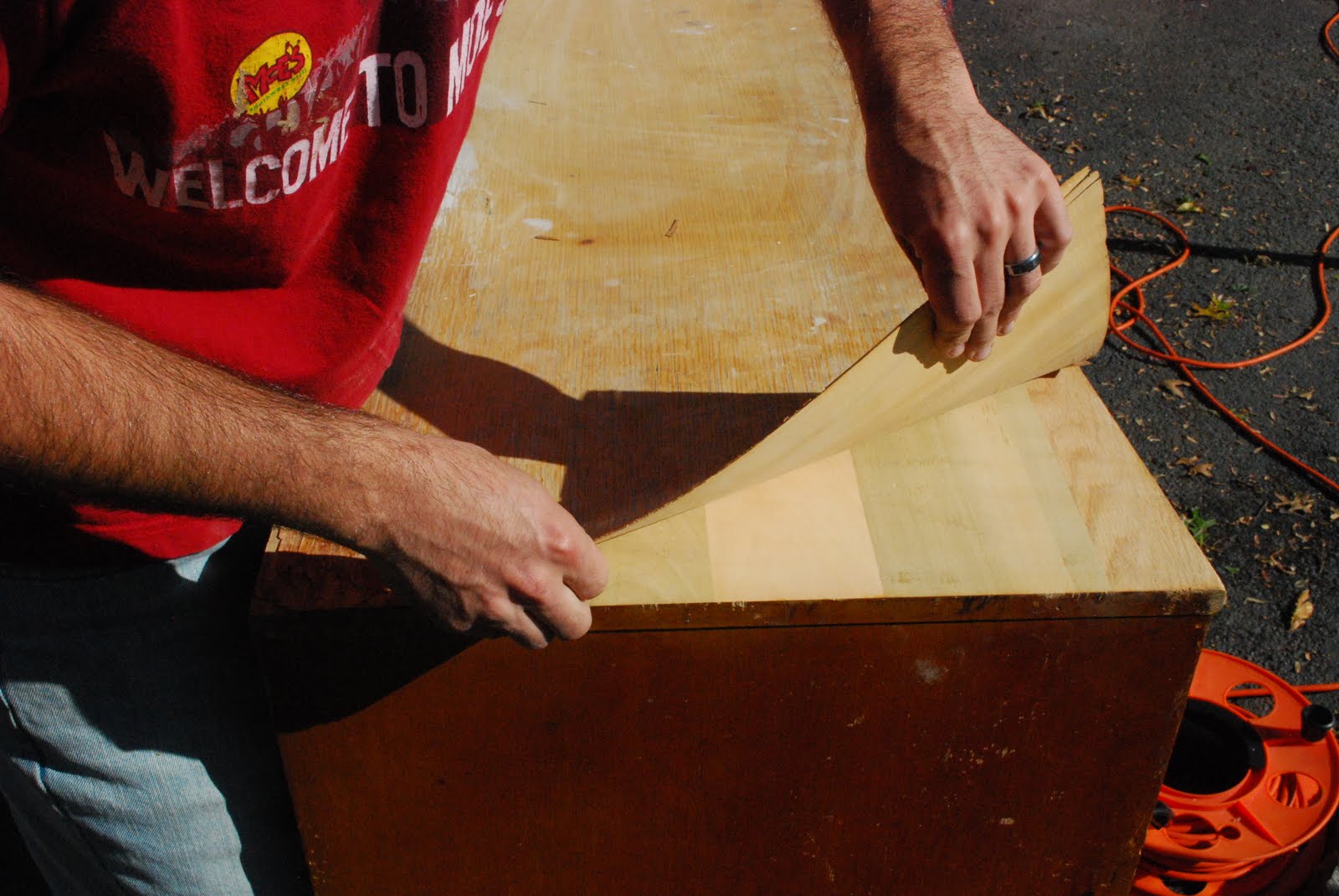 When it started to peel off easily we were in heaven then the fun stopped. We needed to use a spatula/scraper and hammer to loosen up some of the pieces of laminate. By taking the spatula/scraper and placing it under a corner of the laminate you are then able to hammer the spatula and get in under the laminate and slowly start picking away at it.