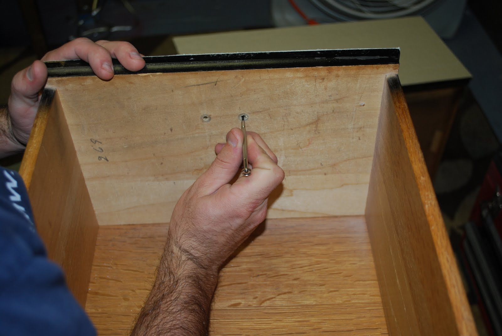 Then take the screw from the handle and full pierce the opening from the front of the drawer: